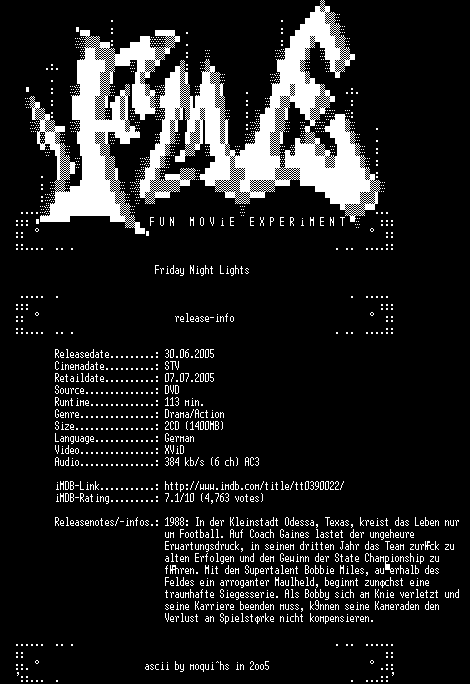 | FiLENAME: | Friday.Nights.Lights.German.2004.AC3.DVDRiP.XviD-FmE.CD2.avi |