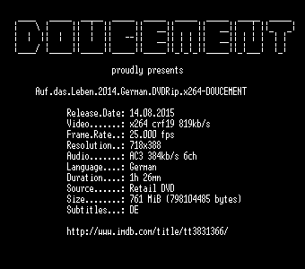 | FiLENAME: | Auf.das.Leben.2014.German.DVDRip.x264-DOUCEMENT.mkv |