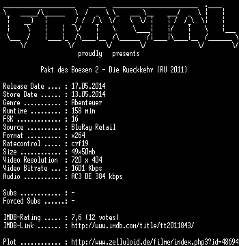 | FiLENAME: | Pakt.des.Boesen.2.Die.Rueckkehr.German.2011.AC3.BDRip.x264-FRACTAL.mkv |