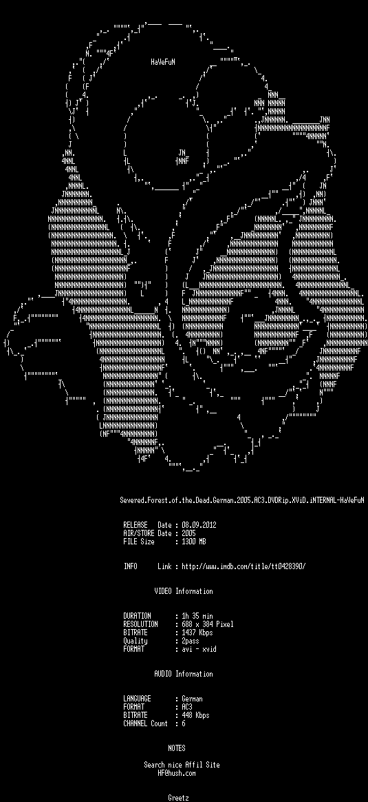 | FiLENAME: | Severed.Forest.of.the.Dead.German.2005.AC3.DVDRip.XViD.iNTERNAL-HaVeFuN.avi |
