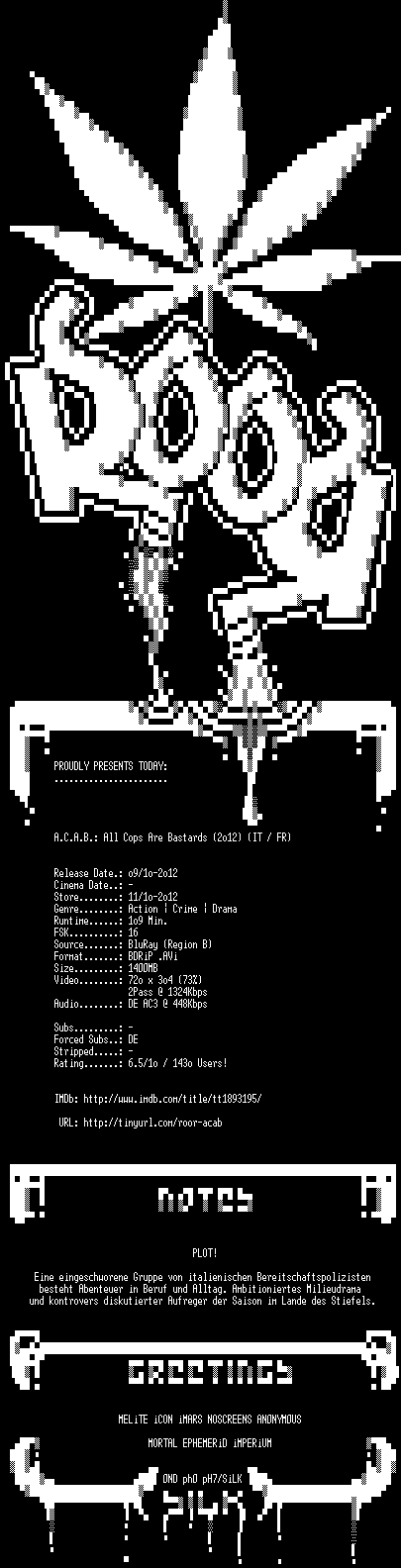 | FiLENAME: | A.C.A.B.All.Cops.Are.Bastards.2012.German.AC3.BDRiP.XViD-ROOR.avi |