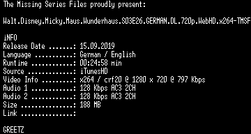 | FiLENAME: | Walt.Disney.Micky.Maus.Wunderhaus.S03E26.GERMAN.DL.720p.WebHD.x264-TMSF.mkv |