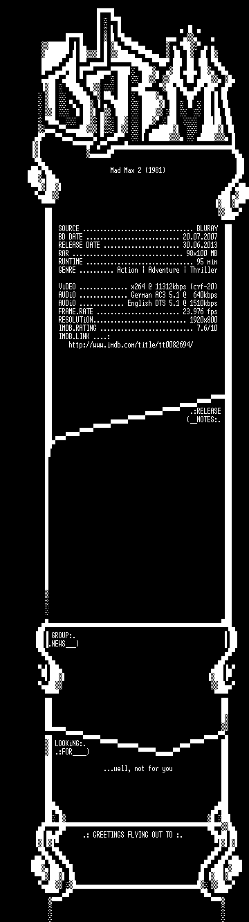 | FiLENAME: | Mad.Max.2.Der.Vollstrecker.1981.German.DL.1080p.BluRay.x264.iNTERNAL-DARM.mkv |
