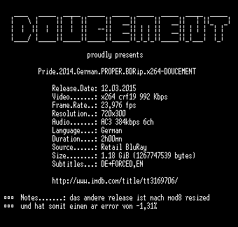 | FiLENAME: | Pride.2014.German.PROPER.BDRip.x264-DOUCEMENT.mkv |