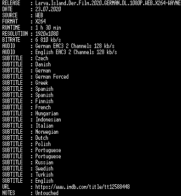 | FiLENAME: | Larva.Island.Der.Film.2020.GERMAN.DL.1080P.WEB.X264-WAYNE.mkv |