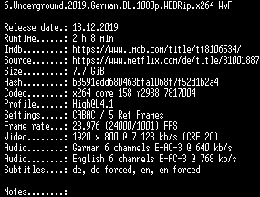 | FiLENAME: | 6.Underground.2019.German.DL.1080p.WEBRip.x264-WvF.mkv |