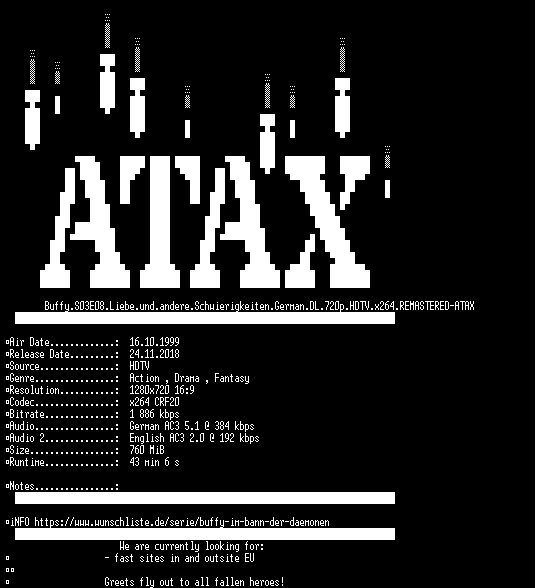 | FiLENAME: | Buffy.S03E08.Liebe.und.andere.Schwierigkeiten.German.DL.720p.HDTV.x264.REMASTERED-ATAX.mkv |