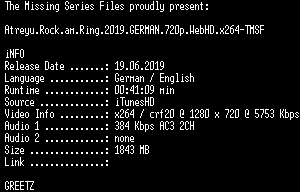 | FiLENAME: | Atreyu.Rock.am.Ring.2019.GERMAN.720p.WebHD.x264-TMSF.mkv |