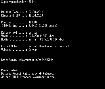 | FiLENAME: | Super.Hypochonder.German.PROPER.DVDRiP.x264-EXQUiSiTE.mkv |