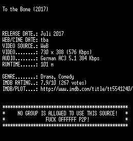 | FiLENAME: | To.the.Bone.2017.German.WebRip.x264-SLG.mkv |