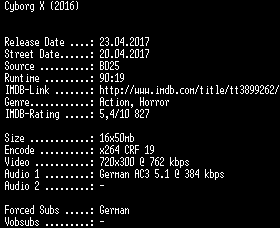 | FiLENAME: | Cyborg.X.German.2016.AC3.BDRip.x264-SPiCY.mkv |