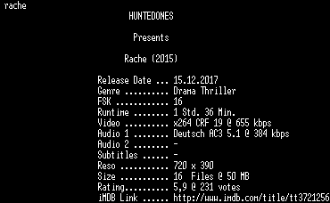 | FiLENAME: | Rache.German.2015.AC3.BDRip.x264-HUNTEDONES.mkv |