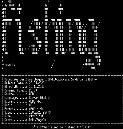 | FiLENAME: | Rute.raus.der.Spass.beginnt.S09E06.Zickige.Zander.am.Elbstrom.GERMAN.DOKU.720p.WebHD.x264-FiSHiNG.mkv |