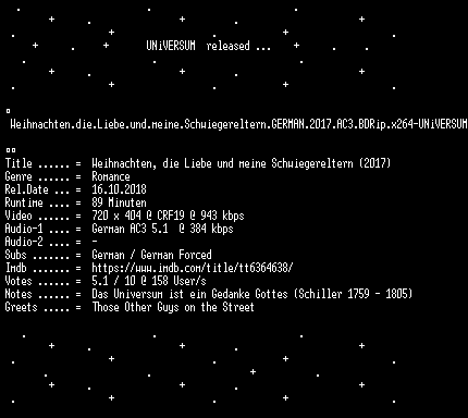 | FiLENAME: | Weihnachten.die.Liebe.und.meine.Schwiegereltern.GERMAN.2017.AC3.BDRip.x264-UNiVERSUM.mkv |