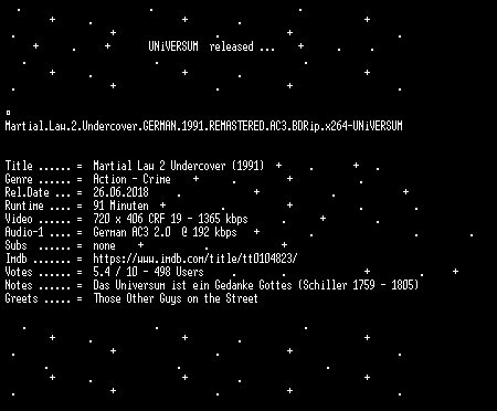 | FiLENAME: | Martial.Law.2.Undercover.GERMAN.1991.REMASTERED.AC3.BDRip.x264-UNiVERSUM.mkv |