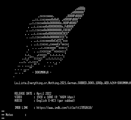 | FiLENAME: | La.Liste.Everything.or.Nothing.2021.German.SUBBED.DOKU.1080p.WEB.h264-DOKUMANiA.mkv |