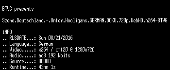 | FiLENAME: | Szene.Deutschland.-.Unter.Hooligans.GERMAN.DOKU.720p.WebHD.h264-BTVG.mkv |